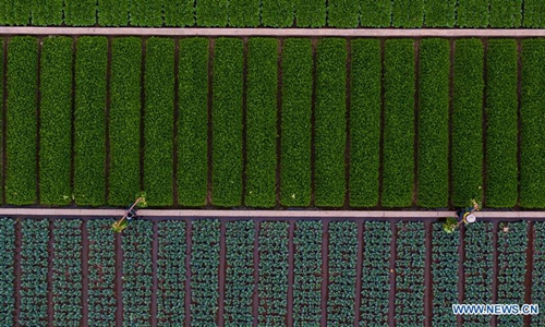 Aerial photo taken on March 4, 2020 shows farmers working in the field in Tonghai County of Yuxi City, southwest China's Yunnan Province. Farmers are busy with farm work as the farming season comes. (Xinhua/Hu Chao)