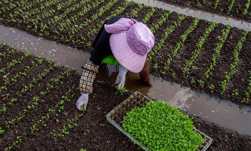 A farmer plants celery in the field in Tonghai County of Yuxi City, southwest China's Yunnan Province, March 3, 2020. Farmers are busy with farm work as the farming season comes. (Xinhua/Hu Chao)