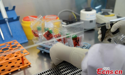 A doctor spays medical alcohol at a 75 percent concentration on packs of samples from throat swabs at a laboratory department of Shanxi Bethune Hospital in Taiyuan, capital of North China's Shanxi Province. Photo:China News Service