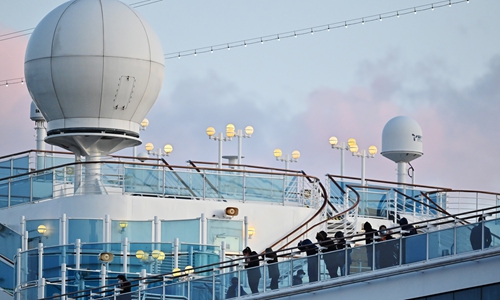 People still in quarantine due to fears of the new COVID-19 coronavirus stand on the deck of the Diamond Princess cruise ship docked at the Daikoku Pier Cruise Terminal in Yokohama on February 18, 2020. Photo: AFP