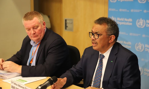 WHO Director-General Tedros Adhanom Ghebreyesus (R) speaks at a daily briefing in Geneva, Switzerland, on March 5, 2020. Photo:Xinhua