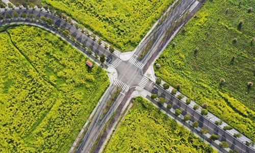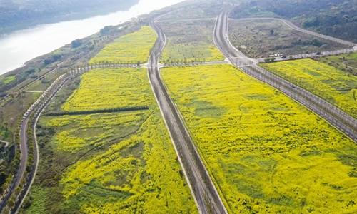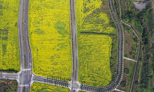 Aerial photo taken on March 6, 2020 shows the scenery of cole flowers at Guangyang Isle of Nan'an District, southwest China's Chongqing. Photo:Xinhua