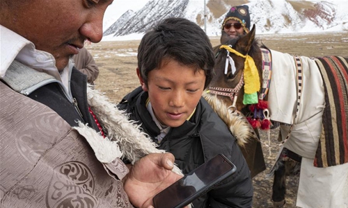 A villager tries wireless network just debugged in a village in Damxung County, southwest China's Tibet Autonomous Region, March 6, 2020. China Telecom's Tibet branch organize personnel to install and debug network lines in remote pastoral areas in northern Tibet to guarantee online classes for local students amid the outbreak of the novel coronavirus disease (COVID-19). (Xinhua/Purbu Zhaxi)