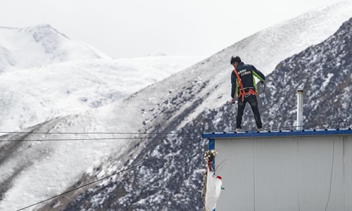 A technician of China Telecom's local branch sets up the network in a village in Damxung County, southwest China's Tibet Autonomous Region, March 6, 2020. China Telecom's Tibet branch organize personnel to install and debug network lines in remote pastoral areas in northern Tibet to guarantee online classes for local students amid the outbreak of the novel coronavirus disease (COVID-19). (Xinhua/Sun Fei)