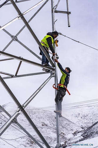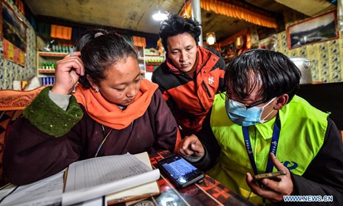 Technicians of China Telecom's local branch debug equipment in a village in Damxung County, southwest China's Tibet Autonomous Region, March 6, 2020. China Telecom's Tibet branch organize personnel to install and debug network lines in remote pastoral areas in northern Tibet to guarantee online classes for local students amid the outbreak of the novel coronavirus disease (COVID-19). (Xinhua/Sun Fei)