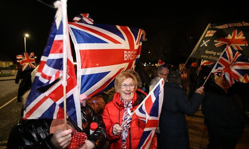 Pro-Brexit supporters celebrate Brexit outside Stormont in east Belfast, Northern Ireland, Britain on Jan. 31, 2020. Britain officially left the European Union (EU) at 11 p.m. (2300 GMT) Friday, putting an end to its 47-year-long membership of the world's largest trading bloc. (Photo by Paul McErlane/Xinhua)