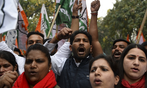 Activists shout slogans during a protest against Hindu-first policies in New Delhi on Monday. Photo: AFP