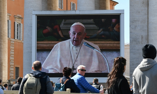 People watch a live broadcast of Pope Francis' Sunday Angelus prayer in St. Peter's Square at the Vatican on Sunday after millions of people were placed under forced quarantine in northern Italy as the government approved drastic measures in an attempt to halt the spread of the COVID-19 outbreak. Photo: AFP
