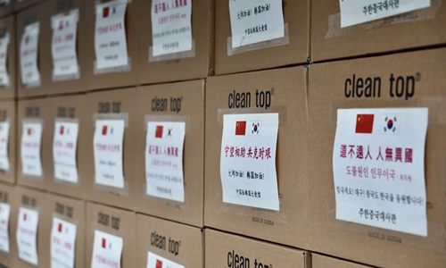 Photo taken on Feb. 27, 2020 shows boxes of masks donated to Daegu by the Chinese Embassy, in Seoul, South Korea. (Chinese Embassy in South Korea/Handout via Xinhua)