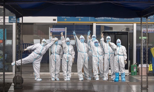The last batch of medical workers pose for a photo after walking out of the temporary hospital of Jianghan, in Wuhan, capital of central China's Hubei Province, March 9, 2020. (Xinhua/Fei Maohua)