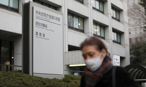 A pedestrian wearing a face mask passes by the office building of the Ministry of Health, Labour and Welfare in Tokyo, Japan, Feb. 25, 2020. (Xinhua/Du Xiaoyi)
