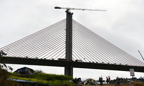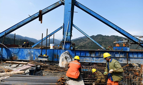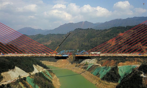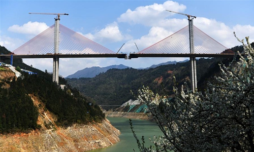 People work at the construction site of Qingshui River extra large bridge in Jianhe, southwest China's Guizhou Province, March 8, 2020. The project resumed construction in an orderly way. (Xinhua/Yang Wenbin)