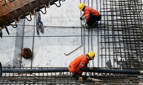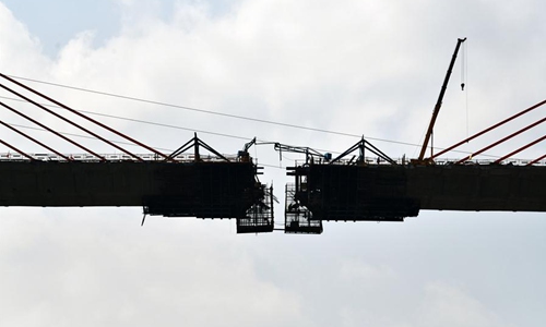 Laborers work at the construction site of Qingshui River extra large bridge in Jianhe, southwest China's Guizhou Province, March 8, 2020. The project resumed construction in an orderly way. (Xinhua/Yang Wenbin)