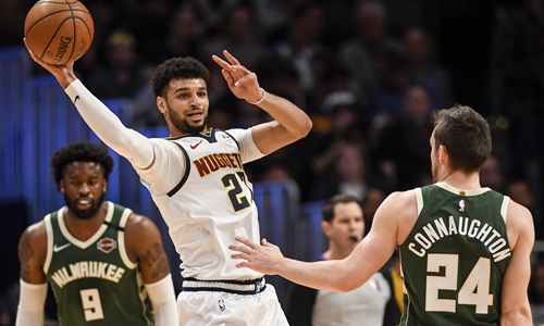 Jamal Murray of the Denver Nuggets looks for an open man in the game against the Milwaukee Bucks on Monday in Denver. Photo: VCG