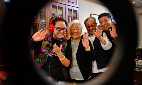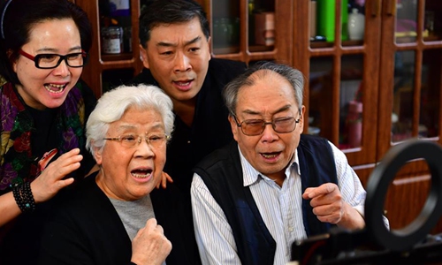 Wu Lingyun (1st R) and his family greet the audience through live stream in Taiyuan, north China's Shanxi Province, March 6, 2020. Due to the epidemic risks of COVID-19, theater performances are suspended. Wu Lingyun moves his stage of Jin Opera to live streaming platform with his parents and his wife, who are all famous performers of Jin Opera. Jin opera is a traditional art form originated in Shanxi Province during the early years of the Qing Dynasty (1644-1911), featured for its energetic singing style. (Xinhua/Cao Yang)