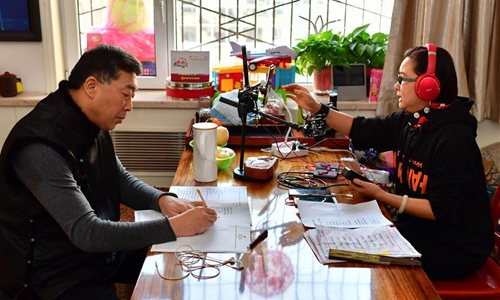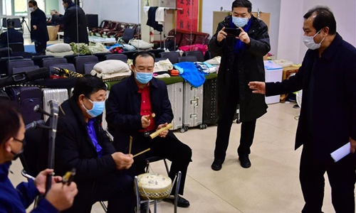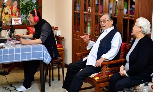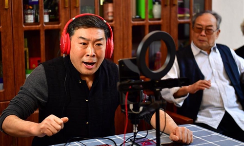 Wu Zhong(C), Wu Lingyun's father, listens to Wu Lingyun's performance in Taiyuan, north China's Shanxi Province, March 6, 2020. Due to the epidemic risks of COVID-19, theater performances are suspended. Wu Lingyun moves his stage of Jin Opera to live streaming platform with his parents and his wife, who are all famous performers of Jin Opera. Jin opera is a traditional art form originated in Shanxi Province during the early years of the Qing Dynasty (1644-1911), featured for its energetic singing style. (Xinhua/Cao Yang)
