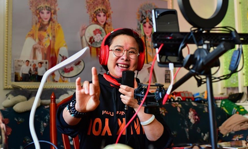 Wang Chunmei, Wu Lingyun's wife, performs Jin Opera through live stream in Taiyuan, north China's Shanxi Province, March 5, 2020. Due to the epidemic risks of COVID-19, theater performances are suspended. Wu Lingyun moves his stage of Jin Opera to live streaming platform with his parents and his wife, who are all famous performers of Jin Opera. Jin opera is a traditional art form originated in Shanxi Province during the early years of the Qing Dynasty (1644-1911), featured for its energetic singing style. (Xinhua/Cao Yang)