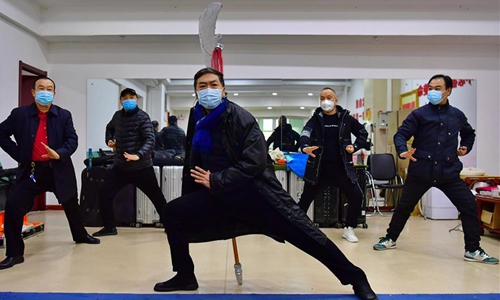 Wu Lingyun (C) is seen during a live streamed rehearsal of Jin Opera at the research center of Jin Opera art in Taiyuan, north China's Shanxi Province, March 9, 2020. Due to the epidemic risks of COVID-19, theater performances are suspended. Wu Lingyun moves his stage of Jin Opera to live streaming platform with his parents and his wife, who are all famous performers of Jin Opera. Jin opera is a traditional art form originated in Shanxi Province during the early years of the Qing Dynasty (1644-1911), featured for its energetic singing style. (Xinhua/Cao Yang)