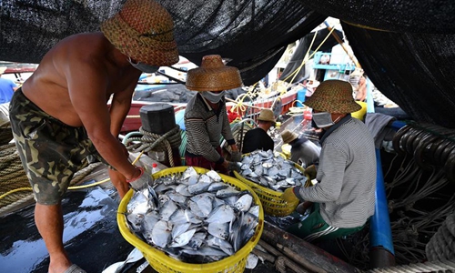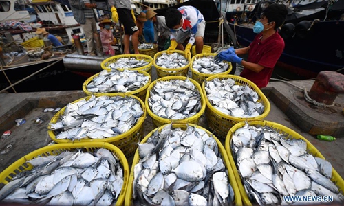 Fishermen unload fish at the Yazhou central fishing port in Sanya, south China's Hainan Province, March 10, 2020. More than 400 fishing boats in the port have started to work as the province's fishing industry resumed operation. (Xinhua/Guo Cheng)