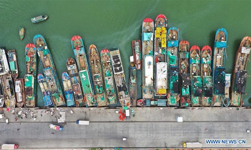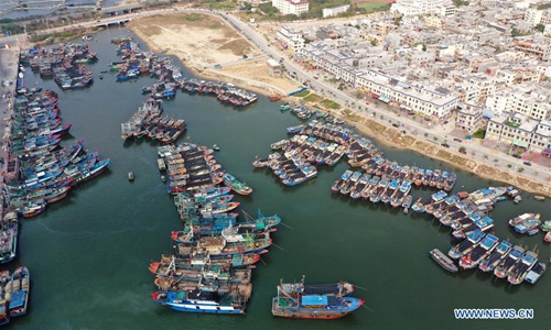 Aerial photo taken on March 10, 2020 shows fishing boats mooring at the Yazhou central fishing port in Sanya, south China's Hainan Province. More than 400 fishing boats in the port have started to work as the province's fishing industry resumed operation. (Xinhua/Guo Cheng)