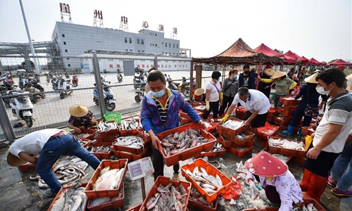 People trade fish at a fish market of the Yazhou central fishing port in Sanya, south China's Hainan Province, March 10, 2020. More than 400 fishing boats in the port have started to work as the province's fishing industry resumed operation. (Xinhua/Guo Cheng)