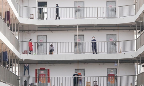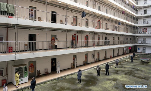 Cured coronavirus patients are seen at the rehabilitation center based in the Wuhan Vocational College of Software and Engineering in Wuhan, central China's Hubei Province, March 10, 2020. Cured coronavirus patients who had been discharged from hospital were required to go on a 14-day quarantine at designated places for medical observation. The rehabilitation center, converted from the dormitory of the Wuhan Vocational College of Software and Engineering, has received more than 600 cured coronavirus patients who were discharged from hospital by Monday. (Xinhua/Xiong Qi)