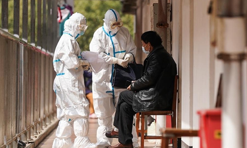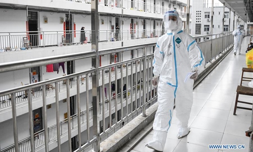 Medical workers inquire a cured coronavirus patient about his health condition at the rehabilitation center based in the Wuhan Vocational College of Software and Engineering in Wuhan, central China's Hubei Province, March 10, 2020. Cured coronavirus patients who had been discharged from hospital were required to go on a 14-day quarantine at designated places for medical observation. The rehabilitation center, converted from the dormitory of the Wuhan Vocational College of Software and Engineering, has received more than 600 cured coronavirus patients who were discharged from hospital by Monday. (Xinhua/Cheng Min)