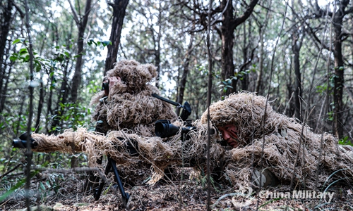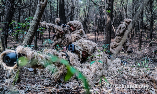 Scout snipers wearing ghillie suits engage the mock targets during a reconnaissance tactical training exercise in the woods recently. They are assigned to a brigade under the PLA 71st Group Army. (eng.chinamil.com.cn/Photo by Wu Hongtai)