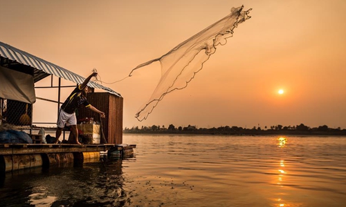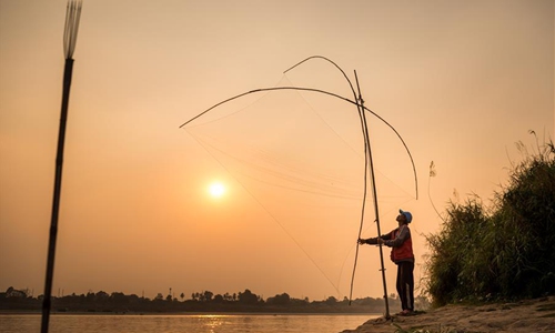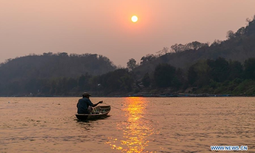 A Lao fisherman fishes in the Mekong River near Vientiane, Laos, on March 10, 2020. (Photo by Kaikeo Saiyasane/Xinhua)