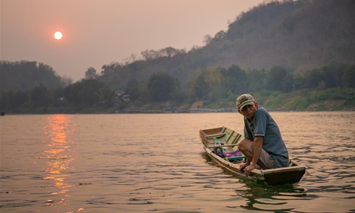 A Lao fisherman is seen on his boat in the Mekong River near Vientiane, Laos, on March 10, 2020. (Photo by Kaikeo Saiyasane/Xinhua)