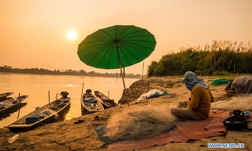 A fisherman repaires his net beside the Mekong River near Vientiane, Laos, on March 10, 2020. (Photo by Kaikeo Saiyasane/Xinhua)