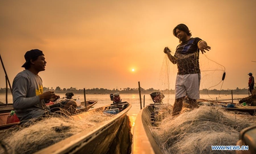 Fishermen chat beside the Mekong River near Vientiane, Laos, on March 10, 2020. (Photo by Kaikeo Saiyasane/Xinhua)