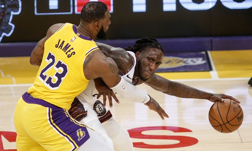 Brooklyn Nets guard Taurean Prince (right) is defended by Los Angeles Lakers forward LeBron James on Tuesday in Los Angeles. Photo: IC