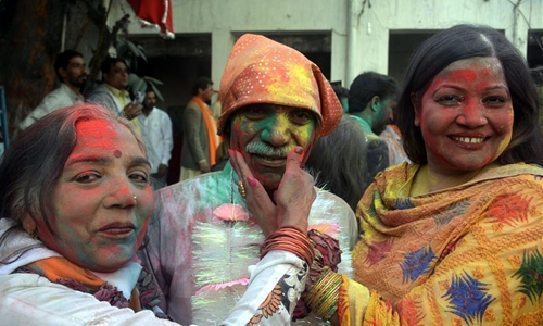 People celebrate during the Holi festival in Lahore, Pakistan, on March 10, 2020. The Hindu festival of Holi, or the Festival of Colors, heralds the arrival of spring. (Photo by Sajjad/Xinhua)