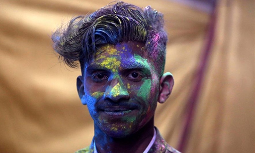 A man poses for a photo with colored face during the Holi festival in Peshawar, Pakistan, on March 9, 2020. The Hindu festival of Holi, or the Festival of Colors, heralds the arrival of spring. (Photo by Umar Qayyum/Xinhua)