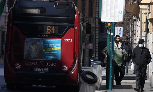 People wearing face masks walk on a street in Rome, Italy, on March 12, 2020.(Photo by Elisa Lingria/Xinhua)