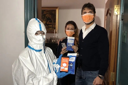 As a translator volunteer, also a policeman from Jing'an public security bureau, Bai Wenchao, spoke fluent Italian via a video telephone to explain the related quarantine policies to the couple.