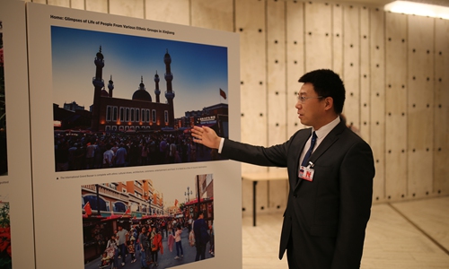 Liu Zhenjiang, a scholar from the Xinjiang Uygur Autonomous Region introduces a photo to visitors during an exhibition at the sidelines of the 43rd session of the UN Human Rights Council in Geneva of Switzerland. Photo: Liu Xin/GT