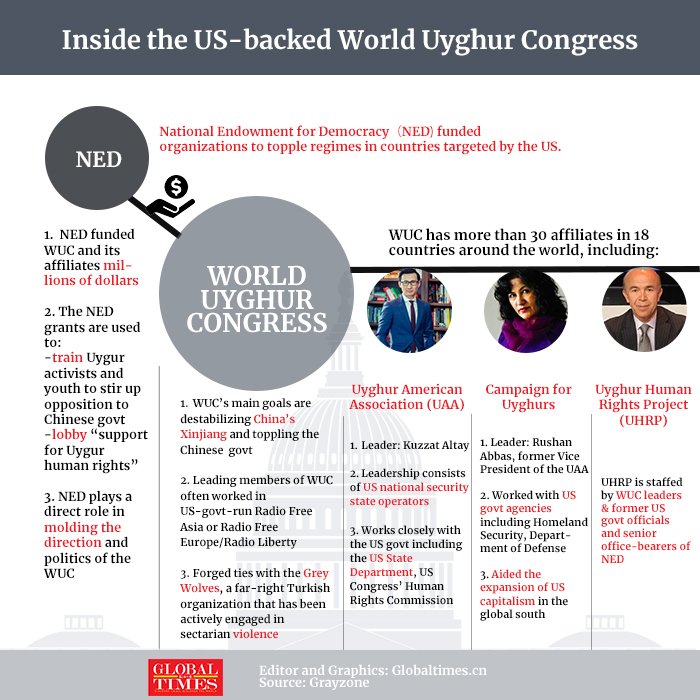 An article published by the US-based news site Grayzone unveiled the self-proclaimed "peaceful" organization World Uyghur Congress (WUC) is a US-backed right-wing regime-change network seeking the "fall of China." Chinese observers said WUC has never cared about Uygur people's rights as the organization heavily relies on US funding and political guidance. The WUC has become a political tool for the US new Cold War and media campaign against China.