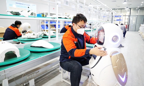 Workers assemble robots at a subsidiary of Chuangze Intelligent Robot Co in Zhangye, Northwest China's Gansu Province on Thursday. Photo: cnsphotos