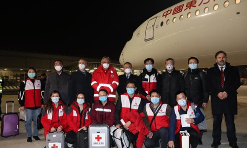 Chairman of Italian Red Cross Francesco Rocca (6th R, back) poses for photos with members of Chinese aid team at Fiumicino Airport in Rome, Italy, March 12, 2020. A charter flight carrying a nine-member Chinese aid team, along with tonnes of medical supplies, arrived at Rome's Fiumicino Airport on Thursday night, in part of China's efforts to help Italy contain the novel coronavirus outbreak. (Xinhua/Cheng Tingting)