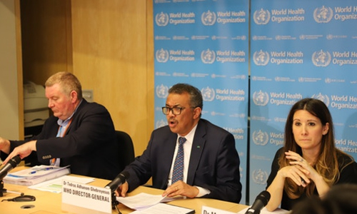 WHO Director-General Tedros Adhanom Ghebreyesus (C) speaks at a daily briefing in Geneva, Switzerland, on March 5, 2020. (Xinhua/Chen Junxia)