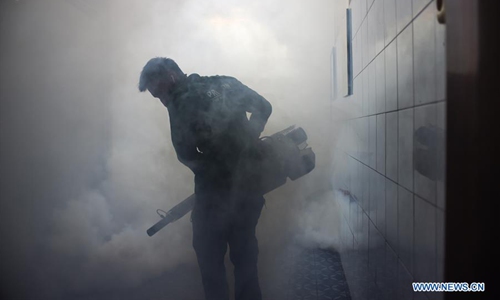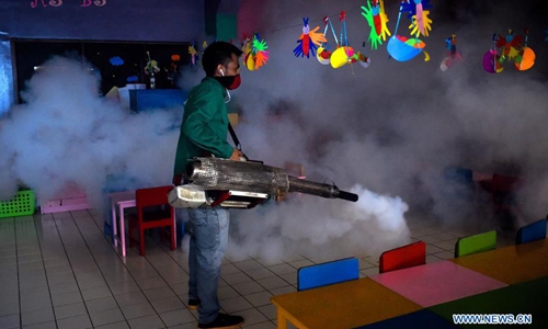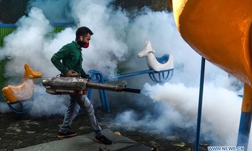 A worker sprays anti-mosquito fog at a playground in Pangudi Luhur School Foundation, Jakarta, Indonesia, March 15, 2020. Dengue fever is a mosquito-borne disease caused by one of four closely related dengue viruses. The disease is transmitted by the bite of an aedes mosquito, particularly an aedes aegypti mosquito, infected with a dengue virus. Controlling the number of the adult and larval population of the mosquito was essential for reducing transmission of the dengue viruses. (Xinhua/Agung Kuncahya B.)