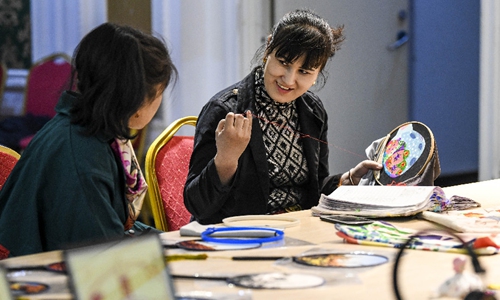 Two seamstresses are working in a traditional handcraft workshop at Hami, northwest China's Xinjiang Uygur Autonomous Region, March 24, 2019. (Xinhua/Wang Fei)