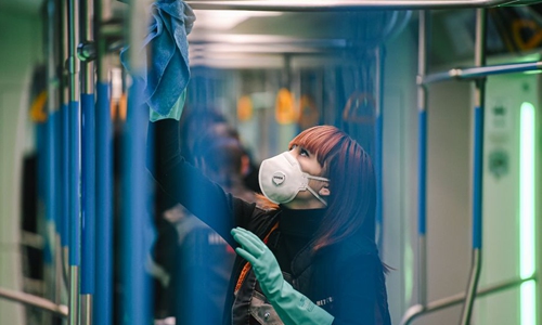A subway worker cleans the handrails as a part of the disinfection procedure in Moscow, Russia, on March 16, 2020. (Photo by Evgeny Sinitsyn/Xinhua)