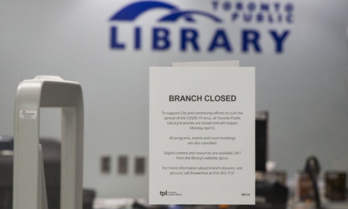 A close notice of a Toronto Public Library branch is seen in Toronto, Canada, March 14, 2020. (Photo by Zou Zheng/Xinhua)