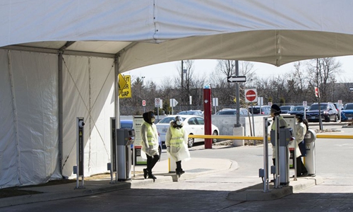 Security officers wearing protective gear are seen at the entrance of Peel Memorial Center for Integrated Health and Wellness in Brampton, Ontario, Canada, on March 15, 2020. (Photo by Zou Zheng/Xinhua)