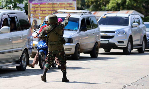 A soldier from the Armed Forces of the Philippines conducts a checkpoint in Lanao Del Sur Province, the Philippines, May 24, 2017. (Xinhua/Stringer)