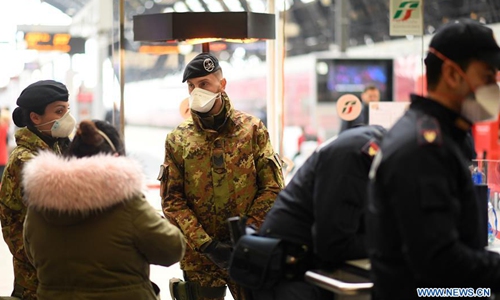 Italian soldiers with face masks are on duty at Milan Central Railway Station in Milan, Italy, on March 9, 2020. Photo: Xinhua