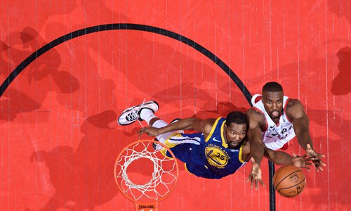 Kevin Durant (left) of the Golden State Warriors and Serge Ibaka of the Toronto Raptors go for a rebound in Toronto on June 10. Photo: VCG